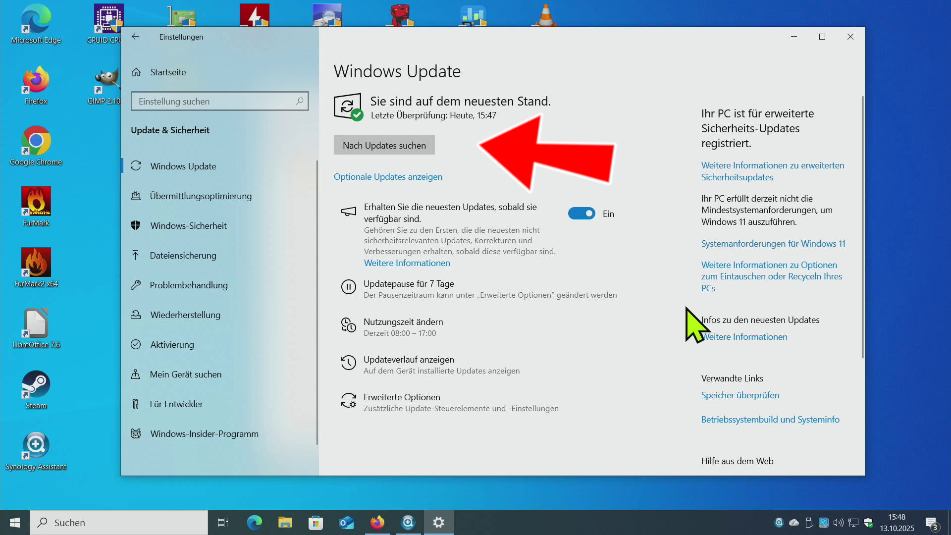 Geht zurück zu den Windows 10 Updates. Der Hinweis auf das Support-Ende für Windows 10 im Oktober 2025 ist verschwunden. Klickt jetzt einfach wie gewohnt auf „Nach Updates suchen“ und ladet euch weiter Windows 10 Sicherheitsupdates bis Oktober 2026 herunter.
