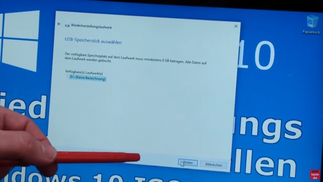 Windows 10 Recovery USB Stick erstellen zum Reinstallieren – USB Speicherstick auswählen